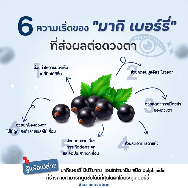 สารสกัดมากิเบอร์รี่ - เพิ่มการไหลเวียนเลือดในลูกตา ช่วยในการมองเห็นในที่มืด เพิ่มน้ําหล่อเลี้ยงตา ลดอาการตาล้า